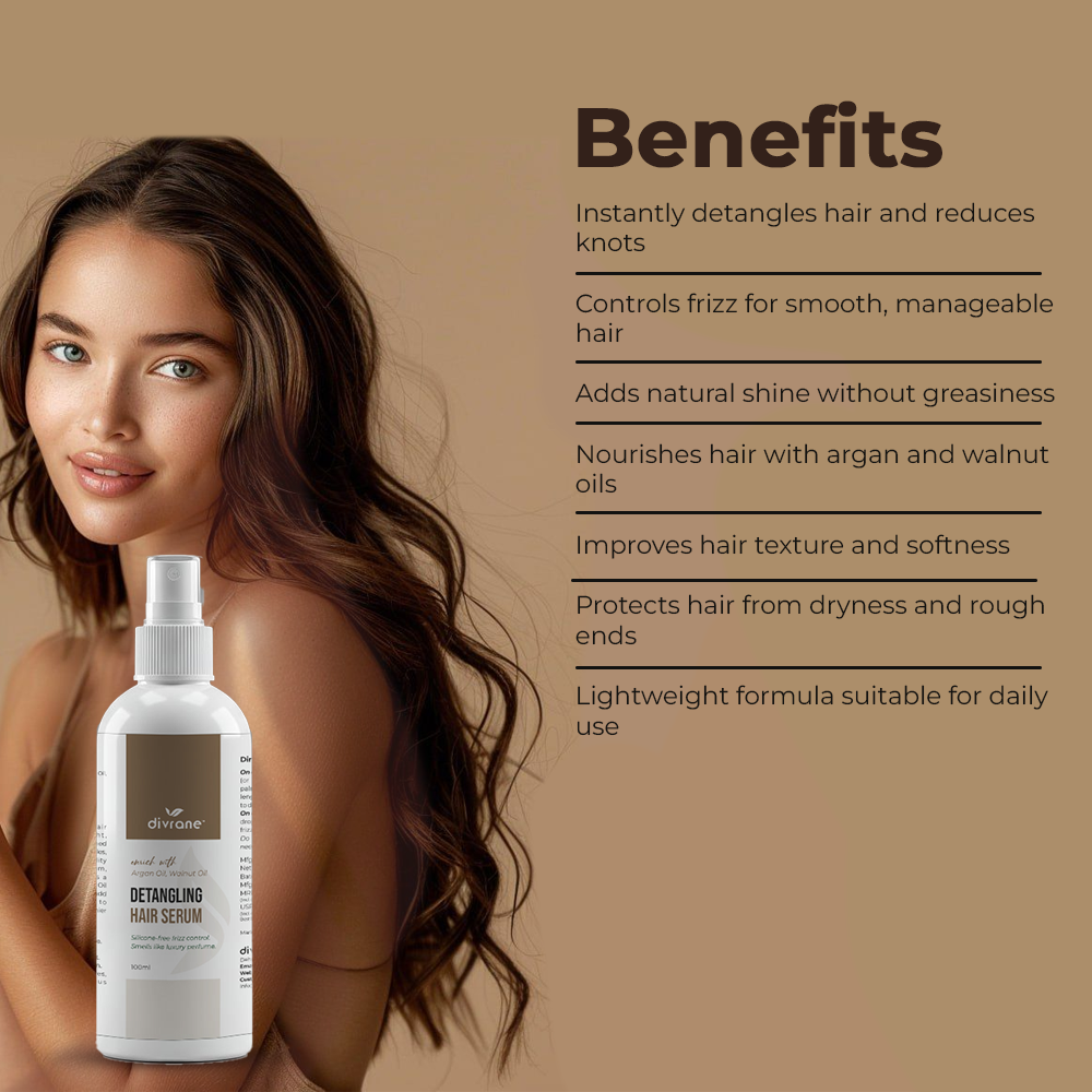 Divrane Detangling Hair Serum is a lightweight, non-sticky serum that instantly smoothens hair, controls frizz, and adds shine with a luxury perfume-like fragrance.