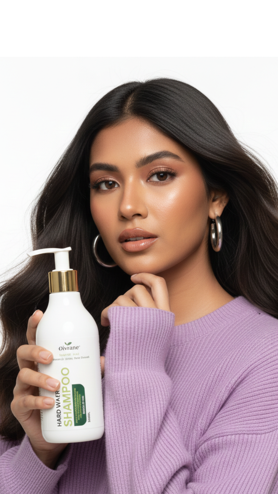 Divrane Hard Water Shampoo is a sulphate-free, clarifying shampoo specially formulated to combat hard-water mineral buildup. It gently cleanses the scalp while restoring softness, shine, and manageability to dull, rough hair.